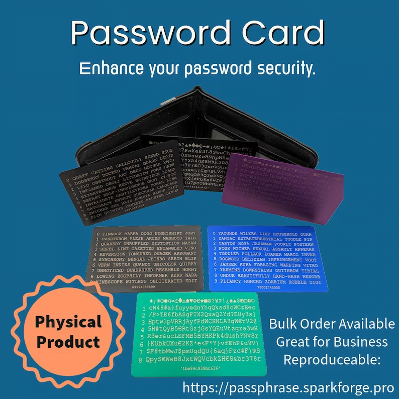 With the Passphrase Card, you’ll never struggle to remember your passwords again. It’s a business card-sized solution to your password security needs, ensuring that your online presence remains safe and protected in an increasingly digital world. Give it a try and experience the simplicity of strong, memorable passwords today.