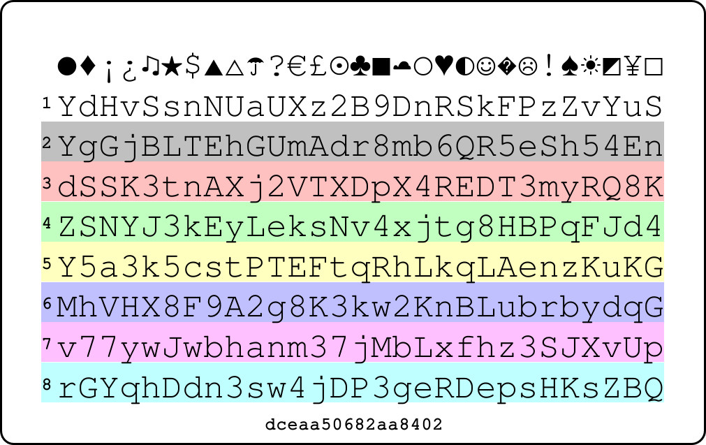 Your PasswordCard has a unique grid of random letters and digits on it. The rows have different colors, and the columns have different symbols. All you do is remember a combination of a symbol and a color and then read the letters and digits from there. It couldn’t be simpler!