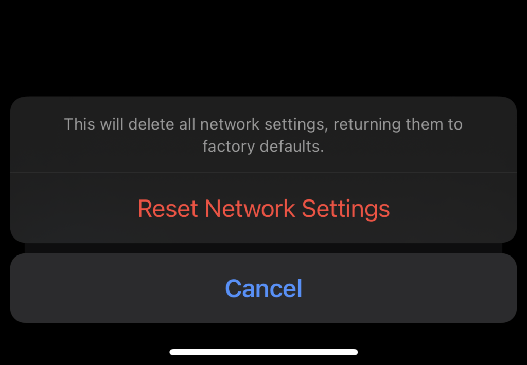 - Settings -> General -> Transfer or Reset -> Reset -> Reset Network Settings