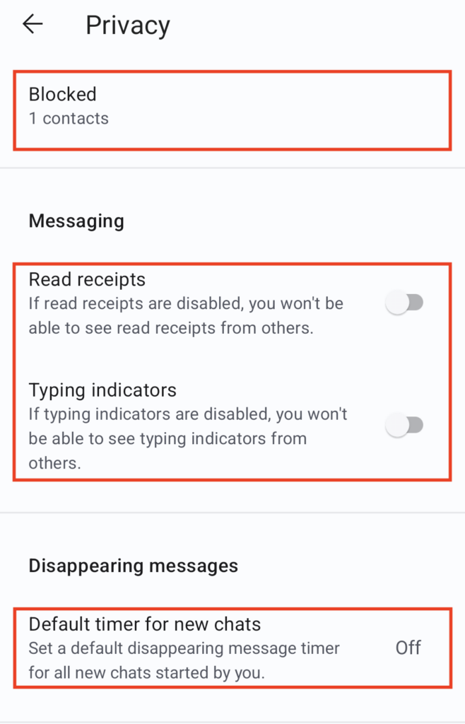 - Disappearing messages is best to set to some sort of time frame. 1 month is a good time but can be set differently for each chat. This way if you forget your messages will get erased after some time period and not endure forever.
