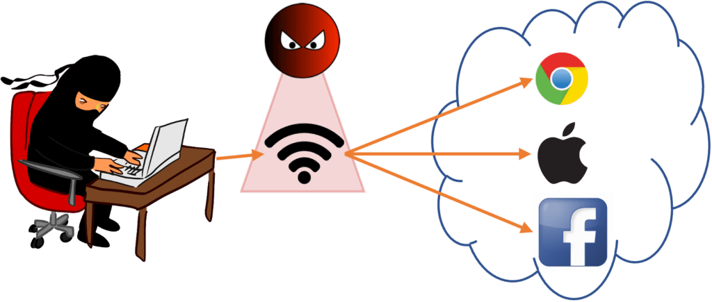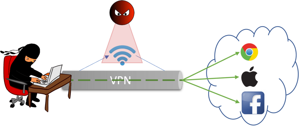 We can’t stop people from hearing or capturing our traffic. What we can do is make it something that cant be understood. We do this with encryption in the form of a VPN that protects us from whoever could be listening. It would look something like this: